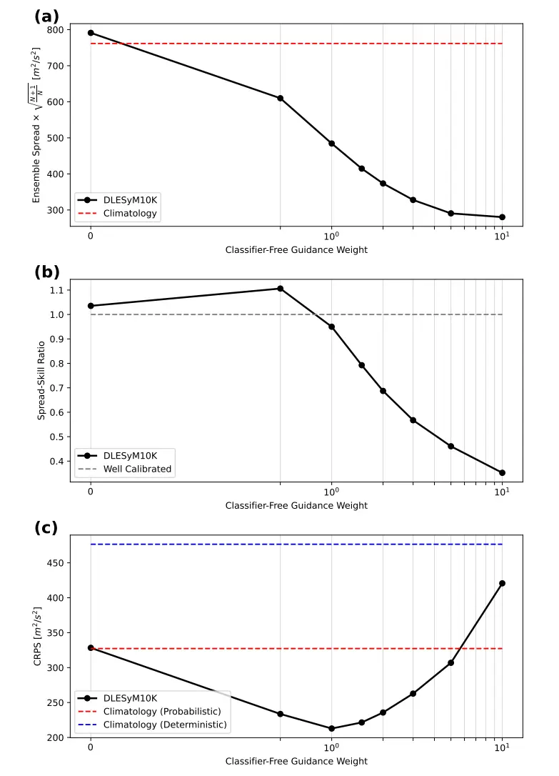 研究採用「無分類器引導」技術來校準概率預報的離散度。通過調節引導強度,可以控制預報集合的分散程度,使其與預報誤差達到最佳平衡。實驗表明,引導強度設為 1 時,模型即可自動實現良好的校準;若需調整,也只需在推理階段簡單調節該參數。這為概率預報提供了一種高效、靈活的校準手段。