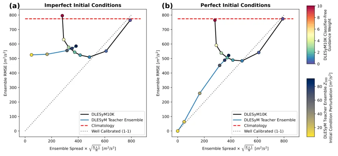 綜上所述,長距離蒸餾方法通過「數據縮放」與「單步概率建模」的結合,訓練出能單步輸出長期概率預報的條件擴散模型,並結合無分類器引導技術實現了靈活的不確定性校準。實驗表明,該方法在次季節至季節預報中已達到與歐洲中期天氣預報中心業務系統相當的性能。這一範式不僅為長期天氣預報提供了新方案,也為構建服務於氣候科學探索的通用生成模型奠定了基礎。