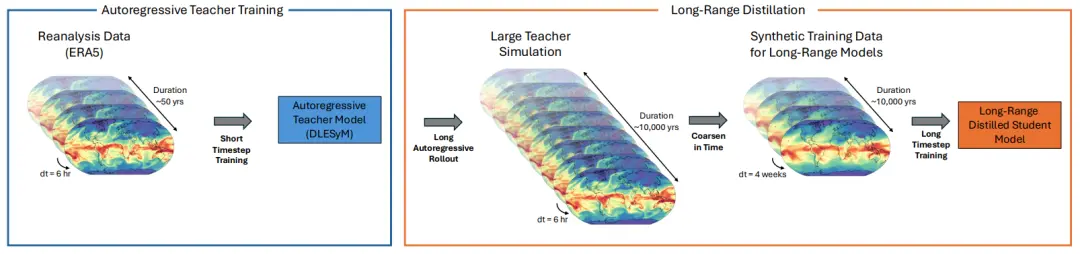 在此背景下,英偉達研究院聯合華盛頓大學的研究團隊推出了一種長距離蒸餾(Long-Range Distillation)新方法,其核心思路是利用擅長生成真實大氣變率的自迴歸模型作為「教師」,通過其低成本、快速模擬產生海量合成氣象數據;再用這些數據訓練一個概率化的「學生」模型。學生模型僅需單步計算即可生成長期預報,既避免了迭代誤差累積,也繞過了複雜的數據校準難題。