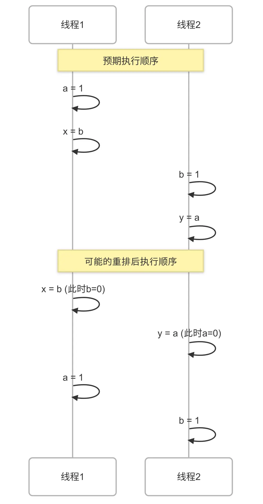 這個例子中,如果按照代碼順序執行,x 和 y 不可能同時為 0。但由於指令重排,程序可能會出現指令執行順序被打亂的情況:先執行了 x=b 和 y=a(此時 b 和 a 都是 0),再執行 a=1 和 b=1,最終導致 x=0,y=0。