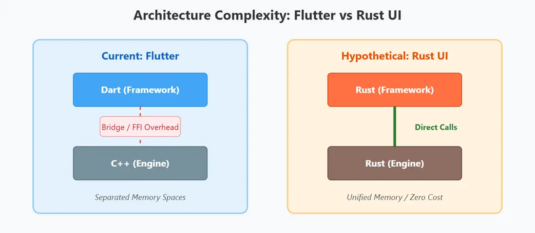 現實世界裏更合理的做法是使用Dart這類高級語言作為UI主棧,同時在需要的地方把性能關鍵模塊用Rust(或C++)實現,通過FFI嵌入。