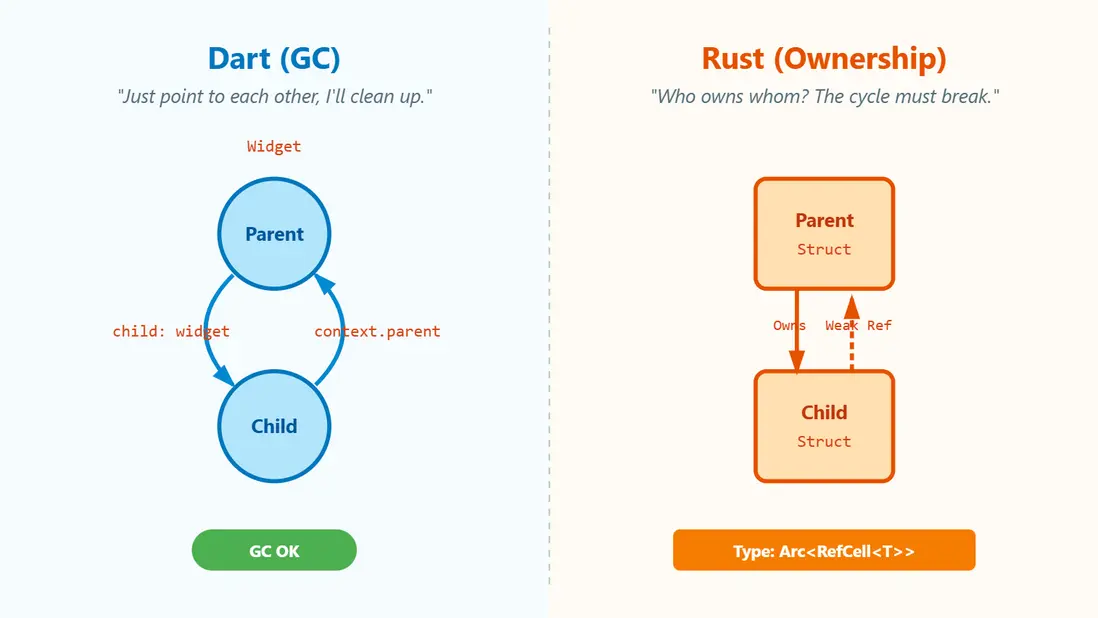 結果就是:乾淨的 Ownership 模型被迫降級到Arc<RefCell<T>> / Arc<Mutex<T>> + Weak 拆環,手動管理引用計數,幾乎把 Java 那套 GC 思維又搬了回來。