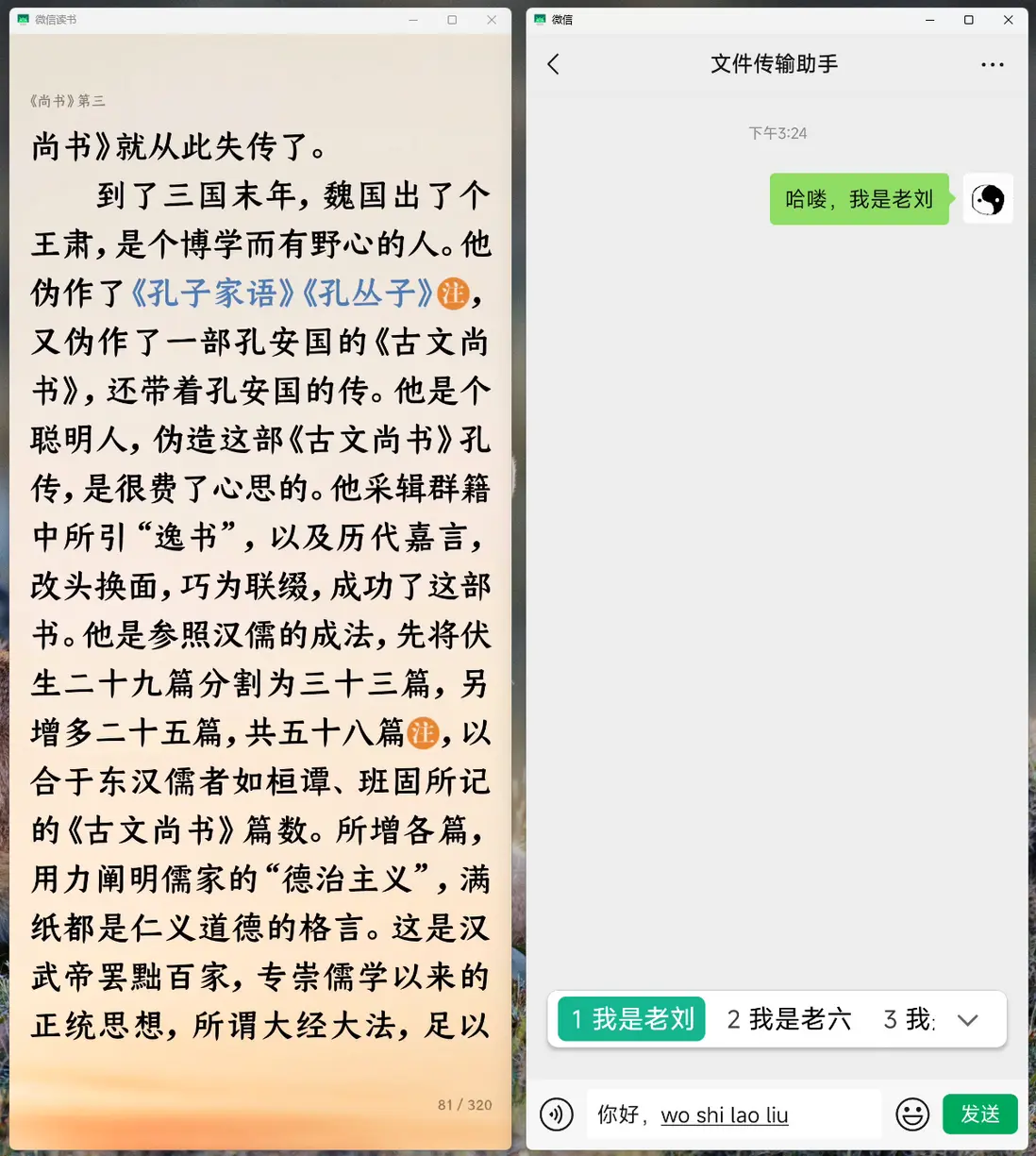 在一個窗口中打開閲讀應用,同時在另一個窗口中打開聊天應用。