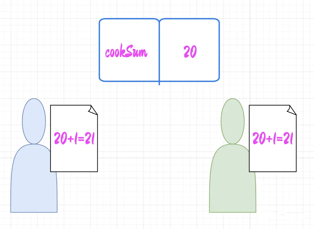 設想有以下場景:廚師們用一個賬本記錄一共做了多少道菜,每個廚師做完菜都記錄一下,每次記錄都是將賬本上的數字先抄到草稿紙上,計算x+1等於多少,然後將計算的結果寫回到賬本上。