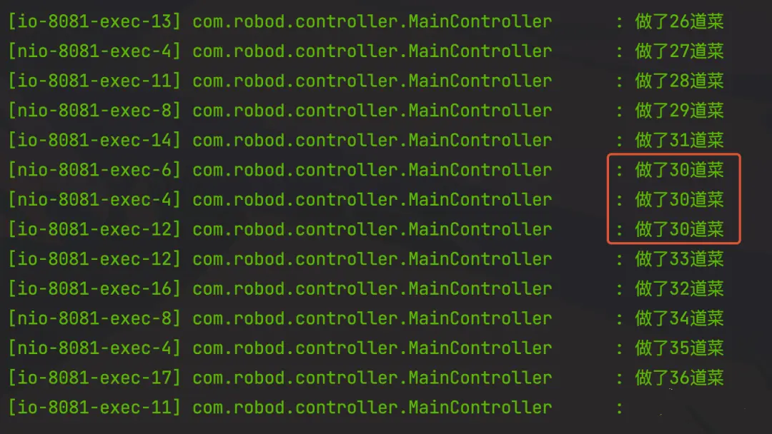 Spring容器中的Bean默認是單例的,也就是説,處理請求的Controller、Service實例就只有一份。在併發場景下,將cookSum定義為全局變量,是所有線程共享的,當一個線程讀到了cookSum=20,然後計算,寫回前另一個線程也讀到是20,兩個線程都加1後寫回,最終cookSum就變成了21,但是實際上應該是22,因為加了兩次。