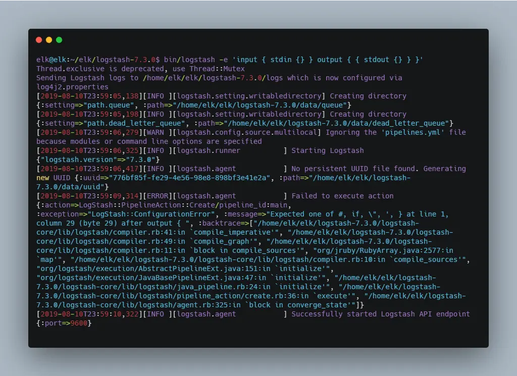 elk@elk:~/elk/logstash-7.3.0$ bin/logstash -e 'input { stdin {} } output { { stdout {} } }'