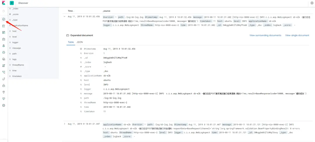 進入 Discover 界面,選擇 logback 索引,就可以看到日誌數據了,如下圖所示。