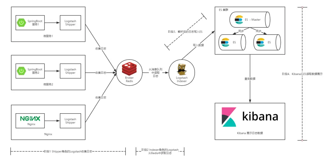 - 在微服務(產生日誌的服務)上部署一個 Logstash,作為 Shipper 角色,主要負責對所在機器上的服務產生的日誌文件進行數據採集,並將消息推送到 Redis 消息隊列。