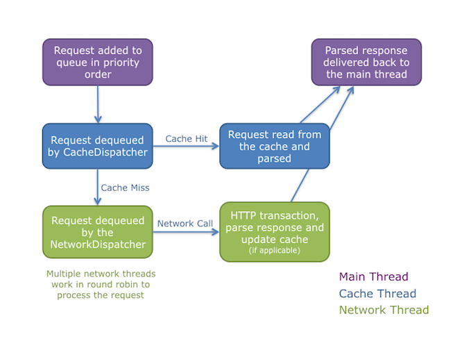 NetworkDispatcher) takes the request from the queue. It then performs the HTTP request, parses the response on the worker thread and writes the response to cache. It then delivers the parsed response back to the main thread.