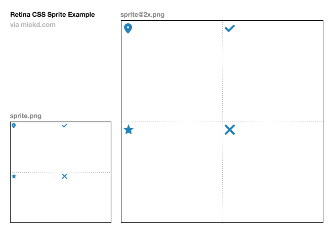 Essentially, you make the sprite exactly (and literally) twice as big, while maintaining its proportions. Then in your ‘normal’ CSS, you load up the ‘normal’ sprite and do all the background-position and sizing stuff to make your sprite work. Then using media queries, you overwrite the background-image with your new retina sprite (when the conditions are correct). You use background-size to shrink the retina sprite, so you don’t have to touch the tedious positioning/sizing stuff. Yay!