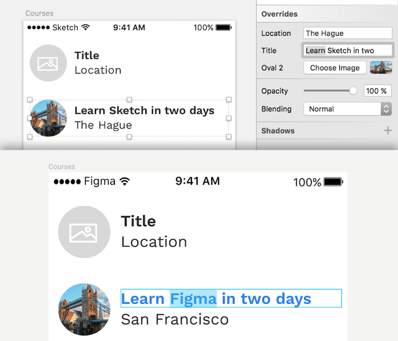 In Sketch, the modifications of individual instances are handled in the form of overrides in the Inspector panel, allowing you to change text values, image fills and nested symbols separately for each instance. Figma lets you update the properties of an element directly on the canvas, including the fill, border and effects (shadows, blurs).