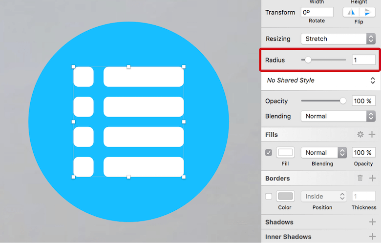 Select all of the rectangles in the layers list so that you can combine them with a Union Boolean operation (press Alt + Cmd + U). This will allow you to set the fill color to white and the radius to “1” for all layers at once. Rename it to “Icon,” drag it into the “List button” group, and center it to the circle in both directions. You can center the artboard again with Cmd + 1.