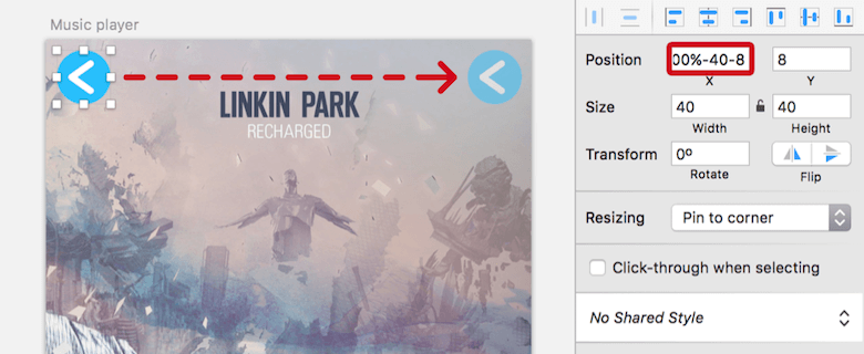 To bring some order to the layers list, rename the circle to “BG” with Cmd + R. Select the circle and the arrow, and create a new group with Cmd + G. Rename this group to “Back.” You can take this back button as a base for the other button in the top-right of the screen, the one to show the list of available tracks. Press Cmd + D to duplicate it, jump to the “X” field in the Inspector, and enter “100%-40-8”: This will move the group, which has a width of 40 pixels, to the right side of the artboard, but will leave a gap of 8 pixels. Center the canvas to it with Cmd + 2, and rename it to “List.” Now, select the arrow with a Cmd + click, delete it, but add a rectangle with a size of 4 × 4 pixels: This will be the base for all other shapes of the list icon.