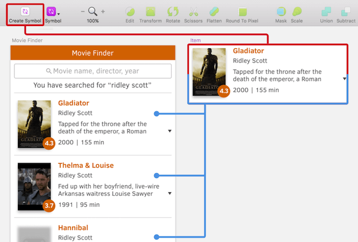 Start by deleting all of the item groups except the first; remove the outer “Group” that Craft created with Shift + Cmd + G, as well as the “Duplicate control” layer, and select the remaining item. Now, click on “Create Symbol” in the toolbar, but don’t send it to the Symbols page. This will place the symbol next to the artboard, which will make modifications easier later because you can instantly see how all instances will be affected.