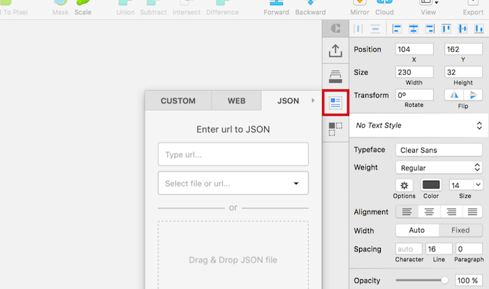 The design is ready. There are numerous ways in which we can fill it with real content (with the help of some plugins), but the best and easiest is Craft. Apart from pulling in data, it also enables us to duplicate elements and vary their contents automatically. After you have installed the plugin, a handy panel next to the Inspector panel will appear (if not, open it with “Craft” → “Toggle Panel” from the menu bar), which will provide more functionality in Sketch. For us, the “data” section (third icon from the top) is of most interest and, in particular, the “JSON” tab.
