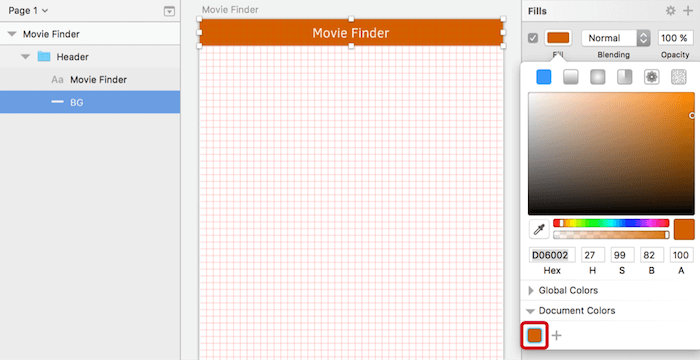 The first time we will use this grid is for the height of the header. Drag the rectangle we just created to be 32 pixels high. Choose a color of your liking that has enough contrast with white text; I went for #D06002, which I also saved to the “Document Colors” in the color dialog with a click on the “+” button, for later reference. For the title, “Movie Finder,” create a new text layer (press T) with a size of 16 pixels and the color white, and center it in both dimensions to the background. My font of choice is Clear Sans by Intel due to its clean look, but also the good selection of weights. Choose the “Regular” weight for the title. Complete the header by moving all of the current elements into a “Header” group.