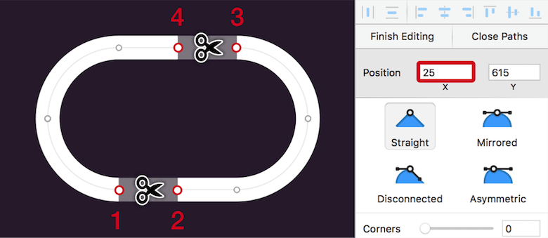 After you have zoomed into the rectangle with Cmd + 2, enter vector point mode with Enter. Add a first point to the straight segment in the bottom left, where it meets with the curve. Copy its X position in the Inspector; add another point to the right, and paste this value but add “+5”. Do the same for the straight top segment, but on the right side: Add a point where it meets with the curve, copy the X position, add a point to the left, paste this value, and subtract “-5px”. Now, use the Scissors tool again to cut the segments between the points: first at the bottom left, then at the top right.