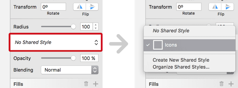 Give this line the same appearance as the repeat icon; the shared style we set up earlier makes this possible. Open the “No Shared Style” dropdown menu in the Inspector, and select “Icons.”