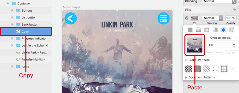 Note: There’s one caveat for both options of image layers. The element can’t be smaller than the container; otherwise, it will be squished. Luckily for us, there’s a way to fix this: Change to a pattern fill. To do so, copy the image layer with Cmd + C, add a fill to the layer, enter its options, go to the second-to-last fill type (“Pattern Fill”), click on the preview area at the left of the dialog, and paste the image with Cmd + V. Now, the image will clip when the container shrinks.