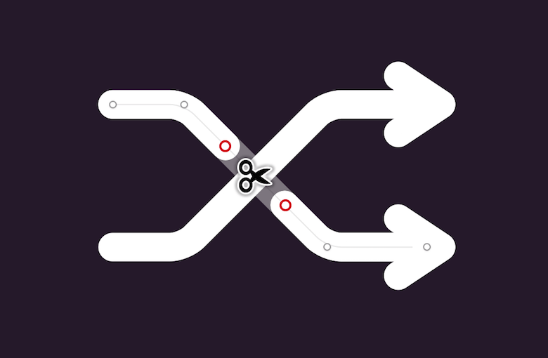 We need to modify the second arrow slightly, so that it breaks where it meets the other one. For this, enter vector point mode for the line again, add a point before and after the intersection, and cut it with the Scissors. Trust your sense of proportion here. Finally, put these two groups into an overarching “Shuffle” group, and rejoice that you’ve finished the second icon.