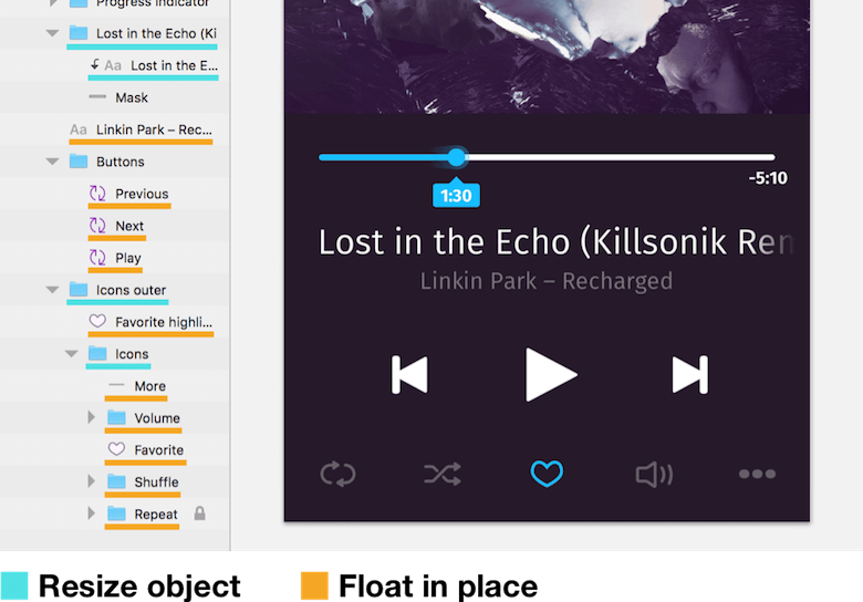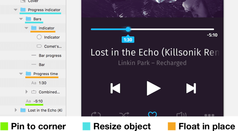 Before we start adding the required subgroups, we can set the “Progress indicator” group itself to “Resize object”; this will retain the spacing of the element but change the width relative to the parent group. Now, select the two bars (“Bar” and “Bar progress”), create a new “Bars” group from them, and set it to “Resize object.” It should also include the “Indicator” group (containing the circular indicator and the comet tail); change it to “Float in place” in turn. This setting makes sure that the indicator follows the colored bar. The same goes for the “Progress time” group. To conclude, pin the total time to the right edge with “Pin to corner.” Give it another try: Resize the container and see the magic unfold before your eyes.