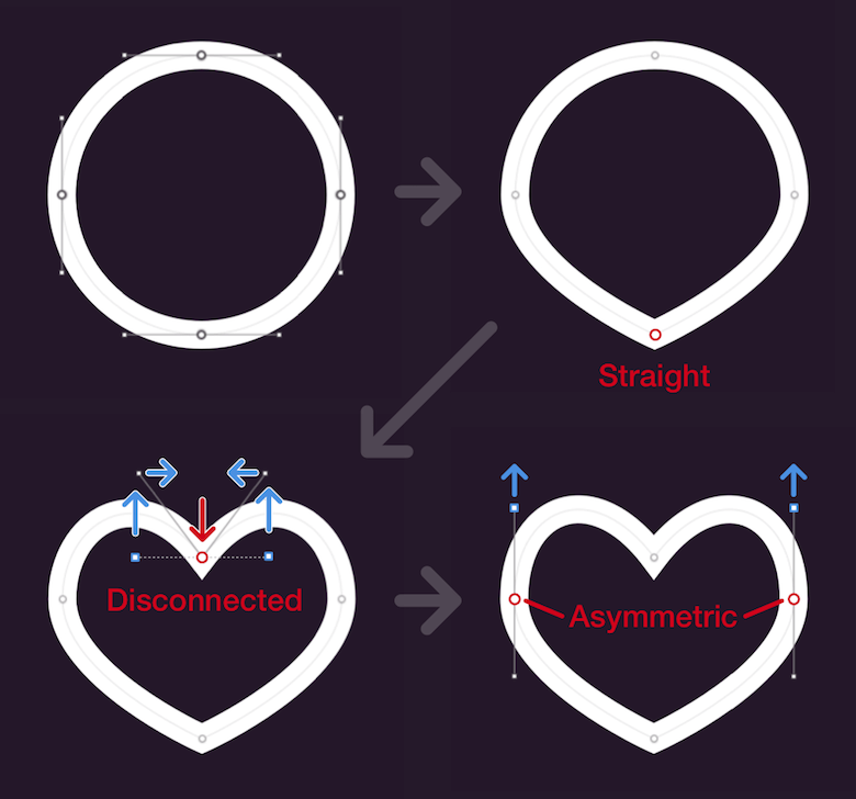 The circle already resembles a heart; we just need to adjust the remaining points on the left and right slightly. Cycle to the left one with another press of Tab. This requires an “Asymmetric” point; press 4 to change to this type. With this adjustment, we are able to move the upper control point just a notch up, independent of its counterpart. This makes the heart a bit more curved at the top. Repeat the same for the vector point on the right (press Tab two more times to select it), and we are almost finished. All we need to do is to rename the shape to “Favorite.” That was a breeze!