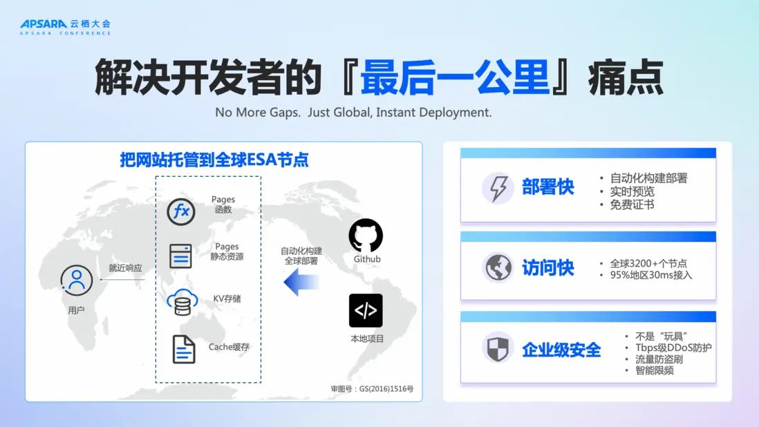 在今年的雲棲大會上,阿里雲邊緣安全加速 ESA 宣佈發佈邊緣開發平台“ 函數和Pages ”。這是國內首個邊緣開發平台的一次重大升級,對標國際同類產品的同時,更以“邊緣原生、企業級安全、全球可達”的標準,系統性重塑從開發到部署、從運維到安全的全鏈路體驗與效率邊界,為中國開發者提供與國際同類產品對標且更貼近本土實踐的落地路徑。阿里雲 ESA “ 函數和 Pages ”以統一的邊緣控制平面為底座,將站點託管與事件驅動的邊緣函數原生打通,和全球加速、CDN 緩存、智能路由、DNS、規則引擎與安全策略體系無縫編排。開發者可通過 GitHub 等代碼託管平台一鍵集成,配合編碼 Agent 實現從需求描述到構建、預覽、灰度、回滾直至全球上線的全自動流水線,顯著縮短“開發幾小時、部署幾天”的週期,實現分鐘級交付。