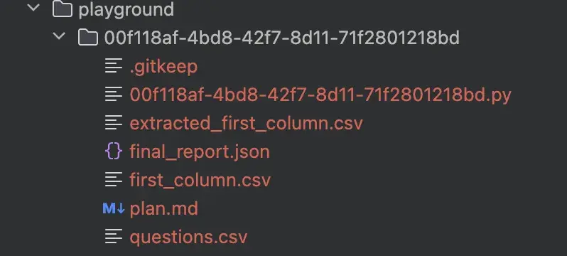 以請幫我將 question.csv 表格中的第一列提取到一個新的 csv 中這個任務為例,運行完成後在工作目錄下包含的內容有: