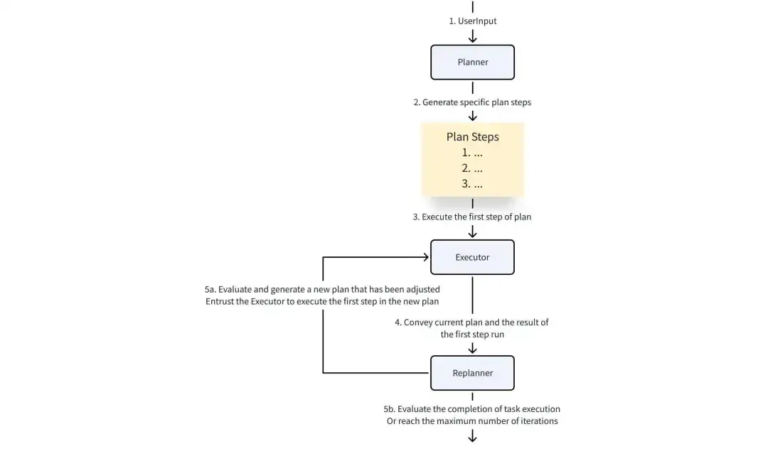 - 循環運行:Executor 和 Replanner 需要按需循環運行多次,每次循環運行都是先運行 Executor 後運行 Replanner