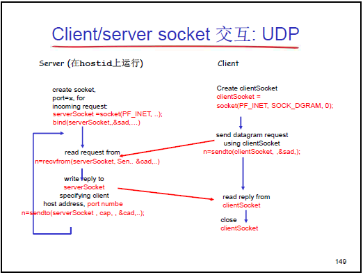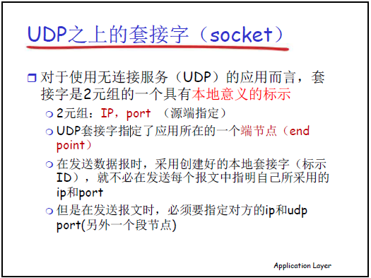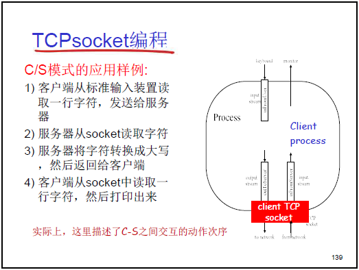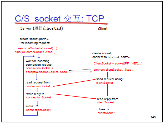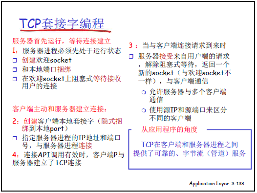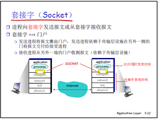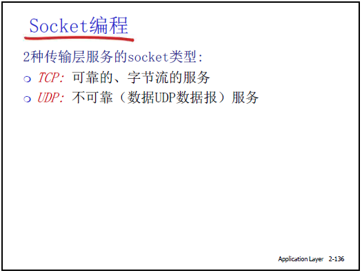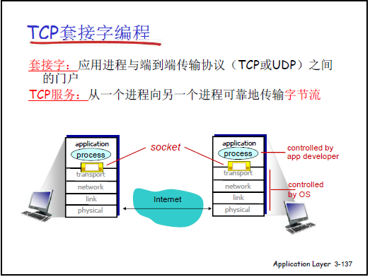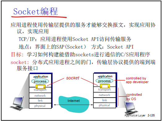 - 應用層通過 socket API 調用傳輸層服務,對應本章的 TCP、UDP 套接字編程內容