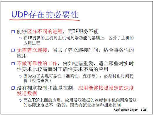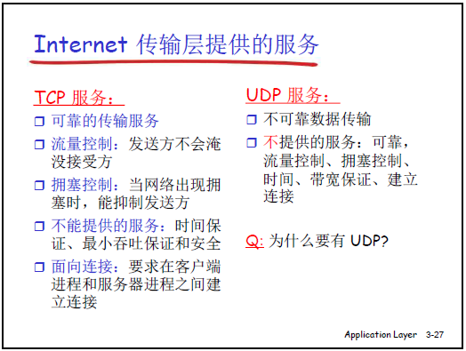 | UDP | 無連接、不可靠傳輸 | 報文服務 |