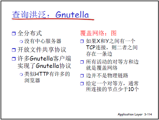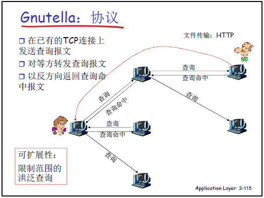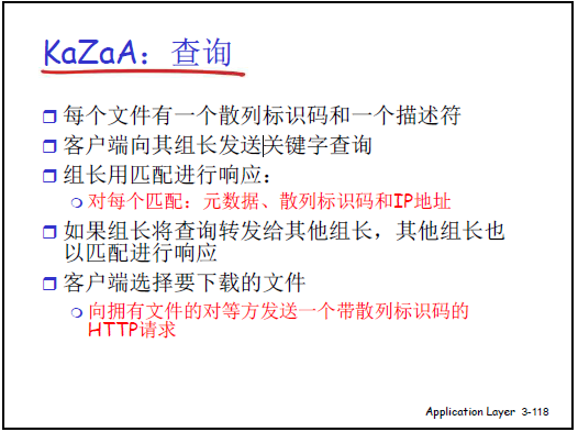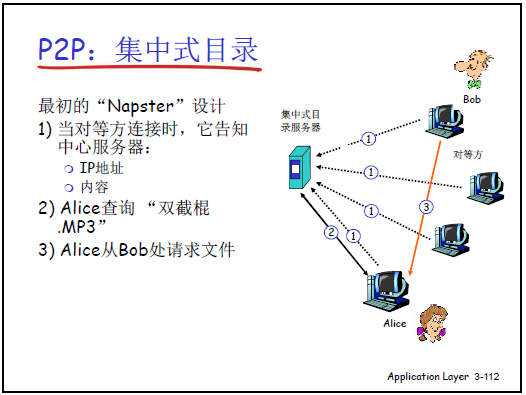 - 目錄查詢(C/S 模式):節點上線時向中心服務器註冊(報告 IP 和共享的 MP3 列表);客户端下載前向中心服務器查詢 “誰擁有目標音樂”,服務器返回擁有者 IP。
