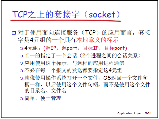 - 核心思想:用一個整數(類似文件句柄)代表 “通信關係的本地標識”,避免每次發送都傳遞 “IP + 端口號” 等重複信息,便於操作系統管理。