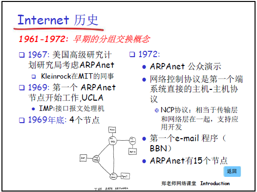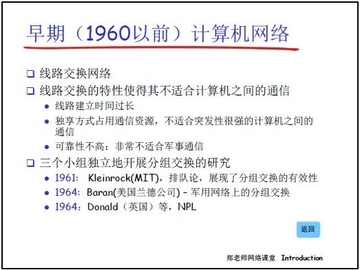 - 1961 年:MIT 的Kleinrock通過排隊論,論證分組交換在突發通信場景下的有效性。