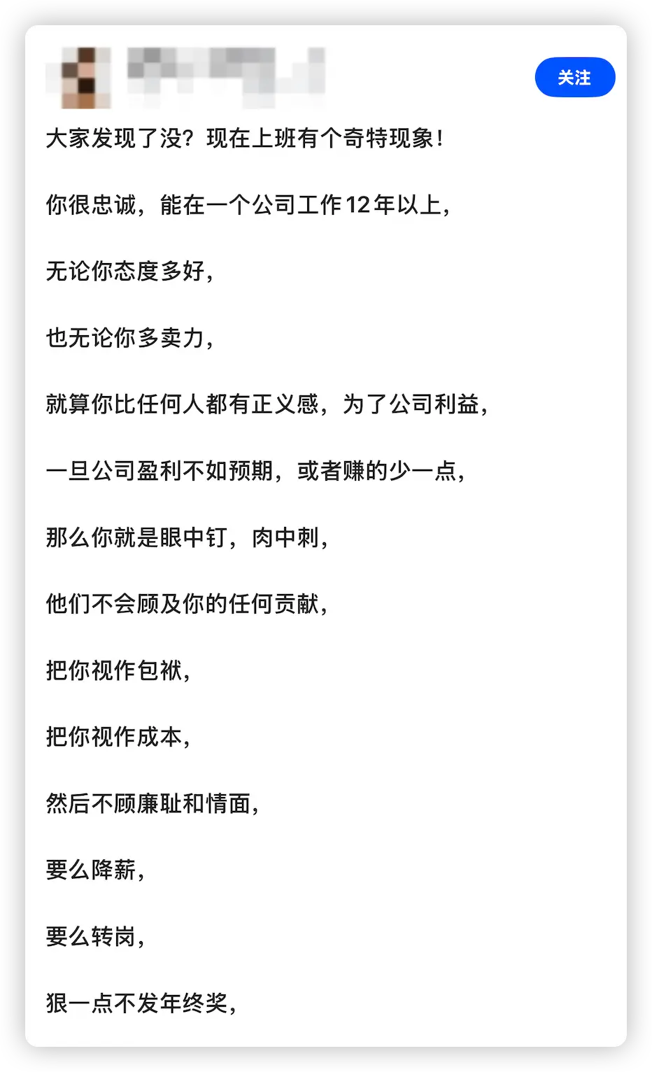 “大家有沒有發現一個奇特現象:你很忠誠,能在一個公司工作 12 年以上,無論你態度多好多賣力,一旦公司賺的少了,那你就成了“眼中釘肉中刺”。