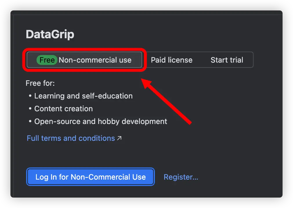 再具體一點,那非商業用途的免費版 DataGrip 如何申請和使用呢