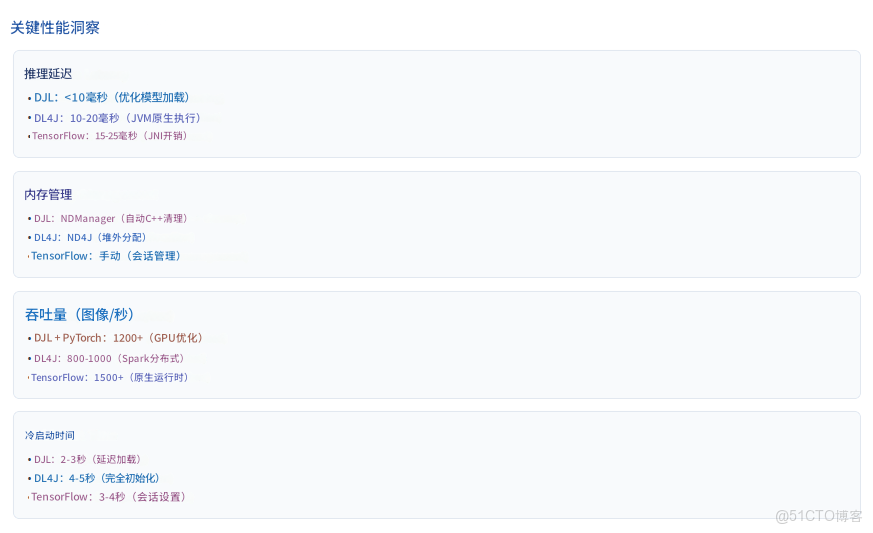 - 內存管理區分了框架:DJL 的 NDManager 解決了管理 JVM 應用程序中本機內存的關鍵挑戰,實現了 100 小時以上的生產運行而無內存泄漏。這種生產就緒性將企業可行的框架與實驗性綁定區分開來。