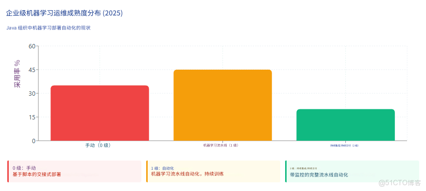 - MLOps 成熟度參差不齊:只有 20% 的 Java ML 部署達到了 Level 2 CI/CD 成熟度,具備自動重新訓練和監控。機會在於將已建立的 DevOps 實踐——容器、編排、可觀察性——應用於 ML 工作流。