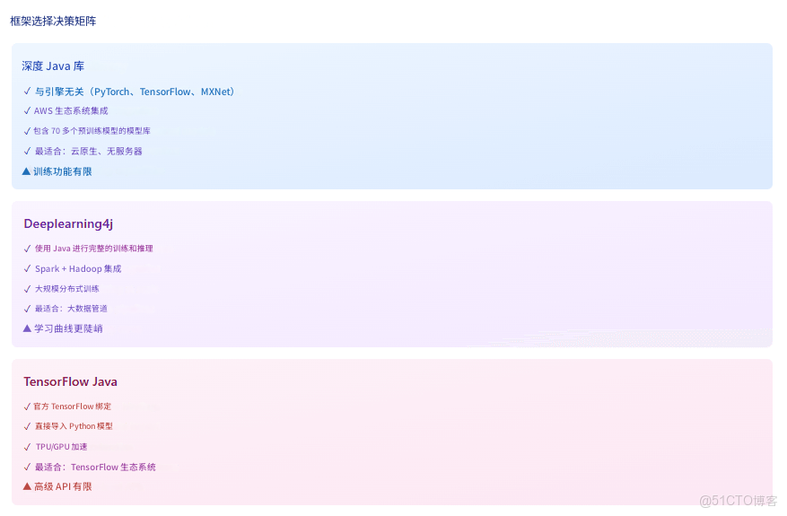 - 選擇 TensorFlow Java 用於:現有的 TensorFlow 投資、TPU 部署、直接的 Python 模型兼容性。