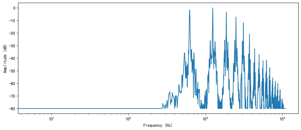 上圖繪製了該音頻片段中存在的各種頻率分量的強度。頻率值位於 x 軸上,通常以對數刻度繪製,幅度位於 y 軸上。