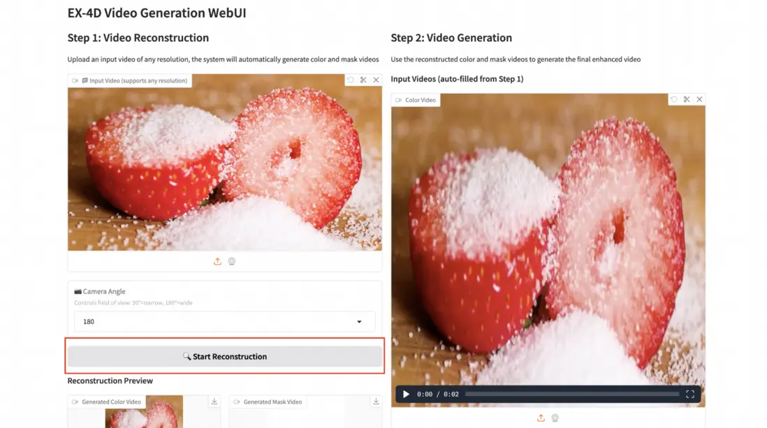 上傳一個草莓視頻,點擊「Start Reconstruction」,開始進行視頻重建。