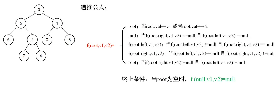 本題求解的是普通二叉樹的公共祖先,即二叉樹的節點值沒有規律性(與二叉搜索樹不同),因此只能分不同情況進行處理: