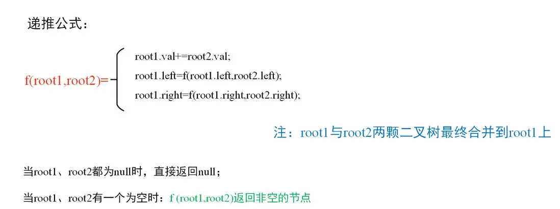 ​   tree1的節點值為兩顆二叉樹節點值的和:t1.val=t1.val+t2.val;