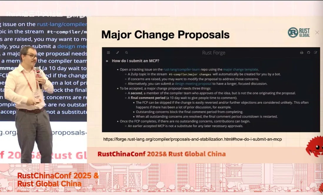 關於語言如何演進,機制多樣:我們有 RFC 流程(請求評議),有模板和一系列章節,説明特性是什麼、為什麼需要、納入語言的代價、如何教授該特性、考慮過但放棄的設計等。這個流程至今帶着我們前進,也會繼續存在並帶我們走向未來,但它非常聚焦於“具體特性”。我們還有 MCP(重大變更提案),更偏戰術層面,用於重構編譯器或修改某個特性的底層行為,只要不產生用户可見影響。還有之前提到的“項目目標”(project goals),我會稍微展開。它們最終都會匯聚成 nightly 特性,並最終通過 RFC 穩定。我們有一個倉庫存放所有發佈過的 RFC,有模板可循。但這一切並非從那裏開始,它從你開始。Rust 的特性不會憑空出現,必須有人提出需求,我們才會考慮和討論。舉個例子:項目成員 Copsol 發現一個特性可以讓“newtype 模式”(不展開,挺簡單)更易用。他不是從寫 RFC 開始的,而是先與他人交流、吸收反饋,寫成自己的文字,然後發成博客,再發一個 pre-RFC(非正式的“我有個想法”)到 internals 論壇供大家討論。經過一輪輪交流後,他提交了 RFC,被接受,如今已實現。這個過程不是隻有項目成員才能做。只要你有具體用例,就可以推動。最終由語言團隊、編譯器團隊等項目團隊討論並決定是否契合。
