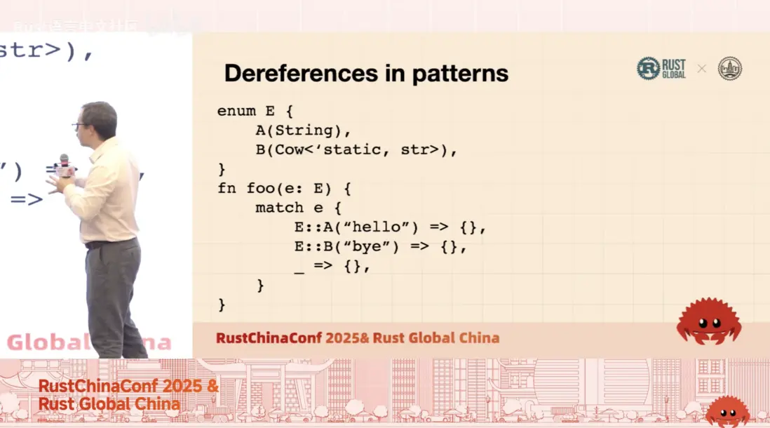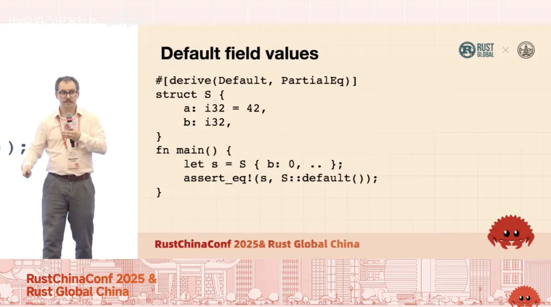 “在模式中使用引用”(references in patterns):如果你熟悉 Scala,這相當於 unapply,允許對需要解引用才能匹配的指針進行模式匹配。比如我們匹配一個字符串字面量,但枚舉變體裏是 String。今天你做不到,必須把 match 改寫成一串 if let 才能表達同樣邏輯。再比如“結構體字段默認值”:這已經在 nightly,將來可能穩定,表達“哪些字段必填、哪些可選”。