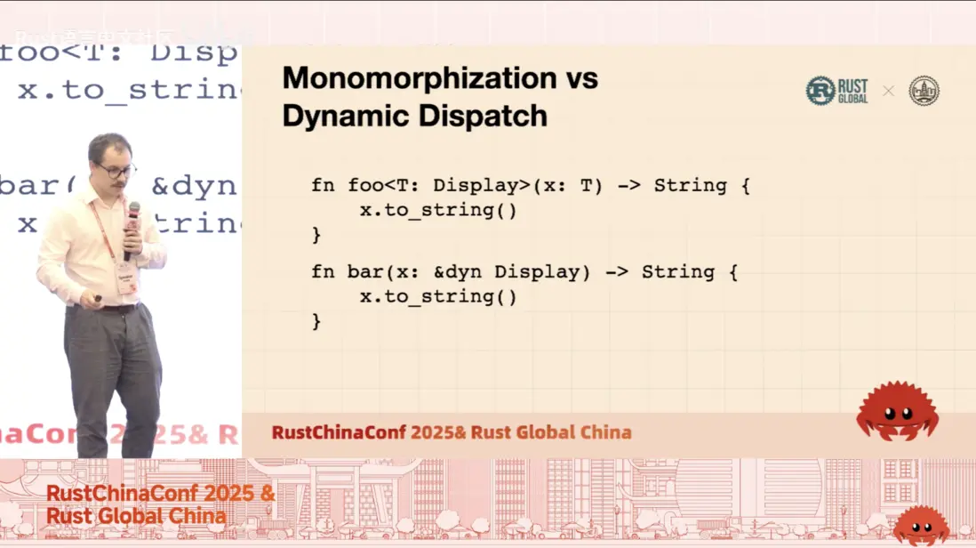 舉個例子:在 Rust 中表達泛型有兩種方式。其一是類型參數,經單態化處理---也就是對傳入的每個具體類型,編譯器都會生成一份獨立函數,最終二進制裏會有對應類型數量的代碼副本。其二是 trait object(dyn trait),通過 vtable 指針間接調用,帶來另一組權衡:二進制可能更小、代碼複雜度可能降低,但會有性能成本。根據你做的事,你可能會選擇其一或其二。對比 Java:在語義上“萬物皆 trait object”,經由 vtable 間接調用。但 Java 有 JVM 和 JIT,會插裝代碼,觀察哪些泛型重複出現,然後執行等效於前者的單態化以提速。複雜性被轉移到實現側(JVM 工程師承擔),語言本身則較少暴露表達力。這只是一個例子,展示 Rust 如何把並非對所有人都“有用”的複雜性暴露出來。Rust 可能讓人產生誤解:複雜性始終存在。你可以寫看起來很高層的代碼,甚至把一段 Python 代碼幾乎逐字翻譯也能跑通,但語言與語義的複雜性一直都在。一旦偏離“易路”,你就會直面“難點”。例如閉包在外觀上類似其他語言,但一旦涉及借用並嘗試執行或傳遞閉包,你可能立刻遭遇借用檢查器錯誤,且在不重寫代碼結構的情況下難以甚至無法解決。這就是當你違反了代碼中表達的契約時會發生的事。