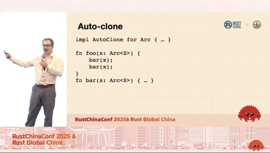 “自動克隆”(auto cloning):看這段代碼,今天會不會(通過)編譯?當然不會,是 move 錯誤。因為一旦消費了 Arc,它就不可用。編譯器今天會提示你要麼改函數簽名避免消費,要麼 clone。對 Arc 來説,90% 的時候你可能確實想 clone。我們可以讓這段代碼“自動為你工作”。