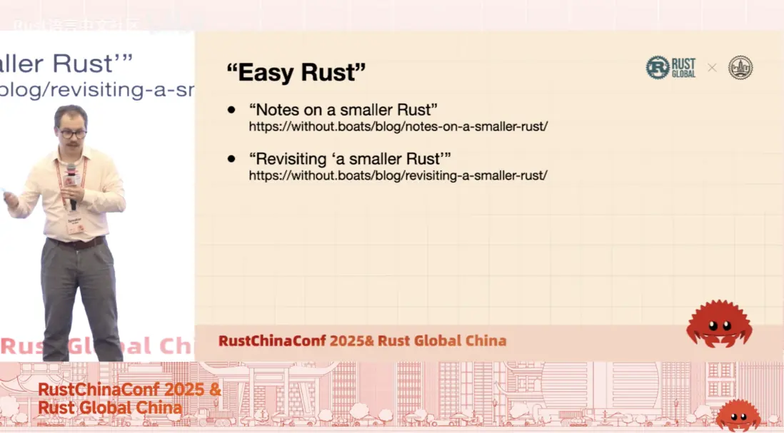 重要的是這個概念,早就被討論過很多次,我不是第一個,也不會是最後一個。Without Boats (譯者注: 知名Rust程序員,有相關公開演講 RustLatam 2019 - Without Boats: Zero-Cost Async IO) 過去也提過一些想法。我想表達的是我的立場,因為人們説“我想要更容易的 Rust”時,心中所指未必相同。