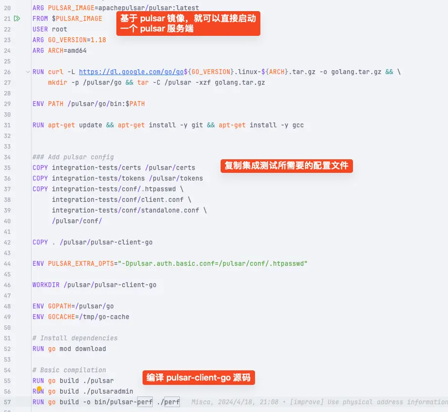 這個鏡像簡單來説就是將 Pulsar 的鏡像作為基礎運行鏡像(這裏麪包含了 Pulsar 的服務端),然後將這個 pulsar-client-go 的代碼複製進去編譯。