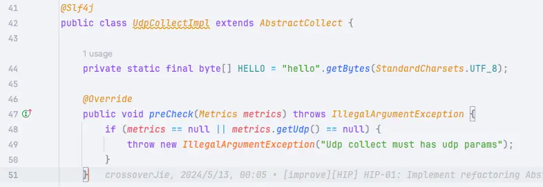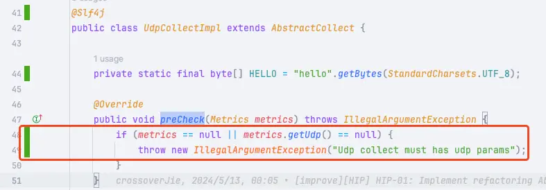 先以一個最簡單的 org.apache.hertzbeat.collector.collect.udp.UdpCollectImpl#preCheck 函數測試為例。